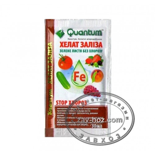 Лечение хлороза растений: - растворить содержимое пакета 30 мл в 5 л воды для фруктовых деревьев или в 7 л воды для других культур. Опрыскивать этим раствором листья растений, не допуская стекания. Обработать 4 раза с интервалом 2 недели. Для ускорения эффекта через неделю после каждой обработки - «Квантумом - Хелат Железа» растения рекомендуется обработать микроудобрениями: «Квантум – Овощные», «Квантум – Декоративные», «Квантум – Плодово-Ягодные», в рекомендованных дозах.