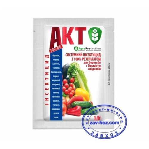 АКТ – инсектицид кишечно-контактного действия, предназначенный для защиты зерновых культур, картофеля, свеклы, смородины, гороха, плодовых деревьев, овощных и цветочных культур. Угнетает вредителей: цикадок, тлей, трипс, белокрылок, плодожерок, медяниц, капустных мух, некоторых видов щитовок и ложнощитовок, колорадского жука и других насекомых.
