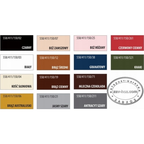 Цвет: чёрный 02, белый 03, тёмно-синий 38, бежевый 07, светло-серый 21, слоновая кость (айвори) 04, тёмно-серый 211, средне-коричневый 12, тёмно-коричневый 19, шоколад 71, красный 261, розовый 25, австралийский коричневый 06, хаки 321.