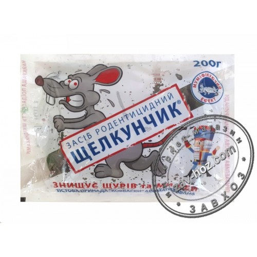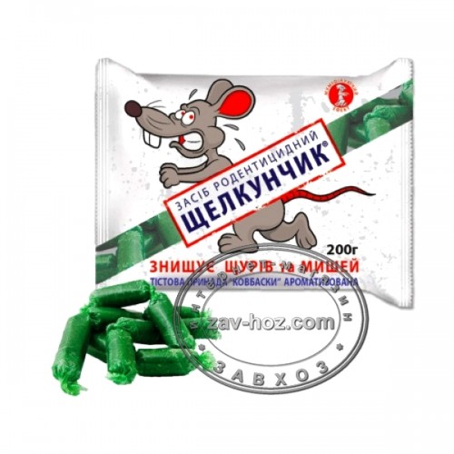 Щелкунчик- тестоподобная готовая к применению приманка для уничтожения крыс и мышей. Благодаря лучшей рецептуре приманки гарантирует 100% уничтожение грызунов, в состав приманки входит масляно-арахисовый привлекатель,феромон,мумификатор.
