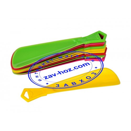 Ложка для обуви пластиковый представляет собой изделие из цветной пластмассы. Он изготовлен в виде небольшой лопатки, плавно переходящей в цельную фигурную ручку, для удобного захвата рукой. В ручке имеется треугольное отверстие, для хранения рожка в подвешенном состоянии. Рожок пластиковый, необходимый атрибут ежедневного многократного использования, и предназначен для удобства в надевании закрытой обуви, не сминая ее пяточную часть. Оптимальный размер рожка для обуви позволяет пользоваться им, как взрослым, так и детям.