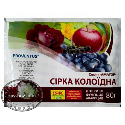 Сера коллоидная (фунгицид) – для защиты плодовых, овощных, цветочных культур и винограда от мучнистой росы, килы, парши, оидиума, антракноза, аскохитоза и растительных клещей.